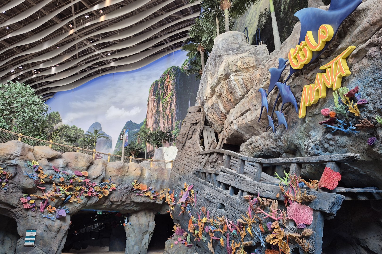 Eén bezoek aan de dolfijnen is voor ons genoeg. Bij de reuzenmanta’s, daarentegen, gaan we drie keer een kijkje nemen. Niet alleen omdat we hun aquarium prachtig vinden, maar vooral omdat ze hun naam lenen aan de belangrijkste thrillride van SeaWorld Abu Dhabi. We hebben het over Manta, een multi-launch coaster van Intamin. De ingang van deze attractie ligt aan het uiteinde van een sfeervol wandelpad, dat gedecoreerd werd met koralen en een scheepswrak. Onze eerste indrukken zijn dus prima en ook de uiteindelijke ritervaring blijkt excellent.
