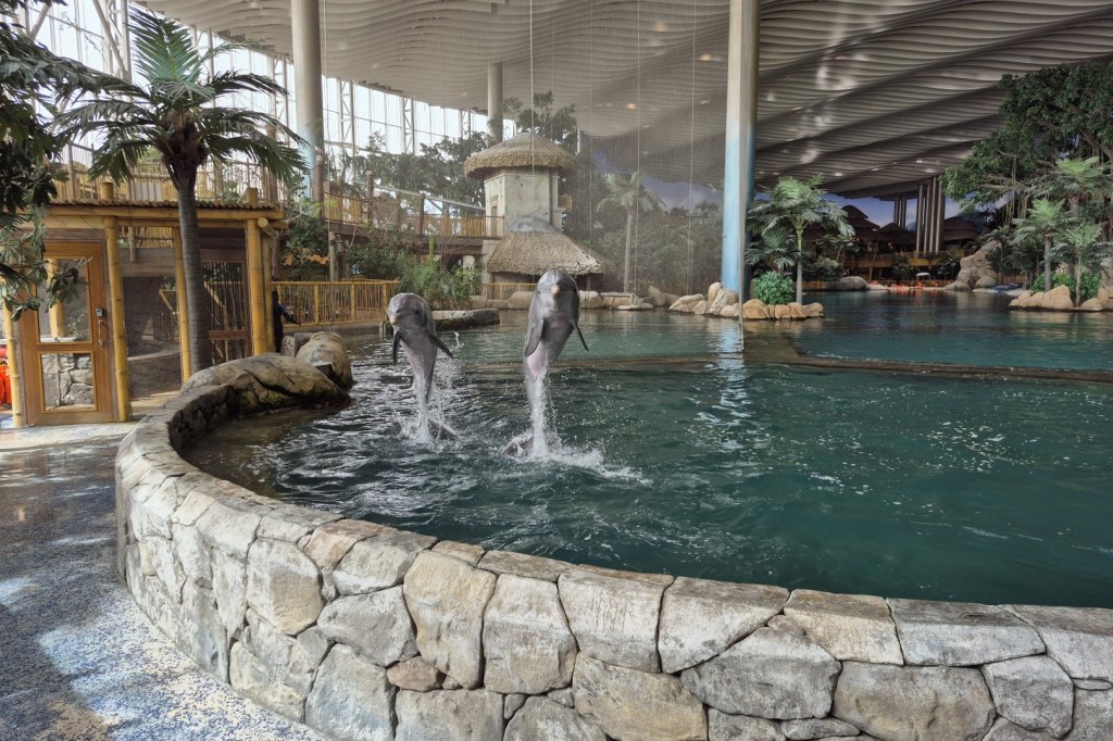 De vogels trekken een mooie hoeveelheid publiek, maar de populariteit van hun buren zullen ze nooit evenaren. Naast het vogelverblijf ligt namelijk een enorme lagune waarin een grote groep dolfijnen rondzwemt. Deze dieren zijn in ieder SeaWorld-park een regelrechte hit en dat is hier in Abu Dhabi niet anders. Ze zorgen bovendien voor entertainment, want een paar keer per dag vindt de Dolphin Presentation plaats in het Tropical Amphitheater. De tribune is knap aangekleed en het uitzicht op de themazone is wondermooi. De eigenlijke show is echter vrij gewoontjes. Het geheel duurt 20 minuten en bestaat uit de sprongen, salto’s en kunstjes die je in ieder dolfinarium te zien krijgt. SeaWorld Abu Dhabi scoort overigens slechte punten door de deuren van het theater tijdens de hele show geopend te laten. Het is dus voortdurend een komen en gaan van toeschouwers, wat vrij storend is voor de bezoekers die wel netjes op tijd hun zitplaats kozen.