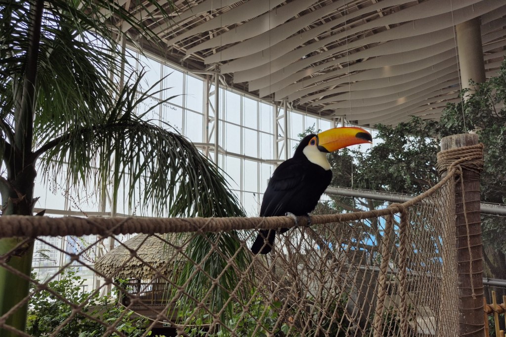 SeaWorld Abu Dhabi is zo’n typisch indoorpark met verduisterde hallen. Ik vind dat prima, want het zorgt ervoor dat de sfeerschepping en belichting tot in de puntjes geregeld kunnen worden. Toch doet het tijdens een pretparkdag eveneens deugd om een streepje daglicht te zien. Dat kan in dit tropengebied, dat aan de zuidkant geflankeerd wordt door een gigantische raampartij. Dit natuurlijke licht maakt het bovendien eenvoudiger om vogels te spotten in The Rainforest. Deze schitterende habitat is de thuishaven van toekans, lepelaars en nog een heleboel andere exotische vogelsoorten. We bewonderen ze vanop wandelpaden die langs de boomtoppen lijken te zweven. Net zoals hun Antarctische collega’s worden deze kleurrijke vogels niet afgeschrikt door nieuwsgierige bezoekers, waardoor we ze van ontzettend dichtbij kunnen bewonderen.