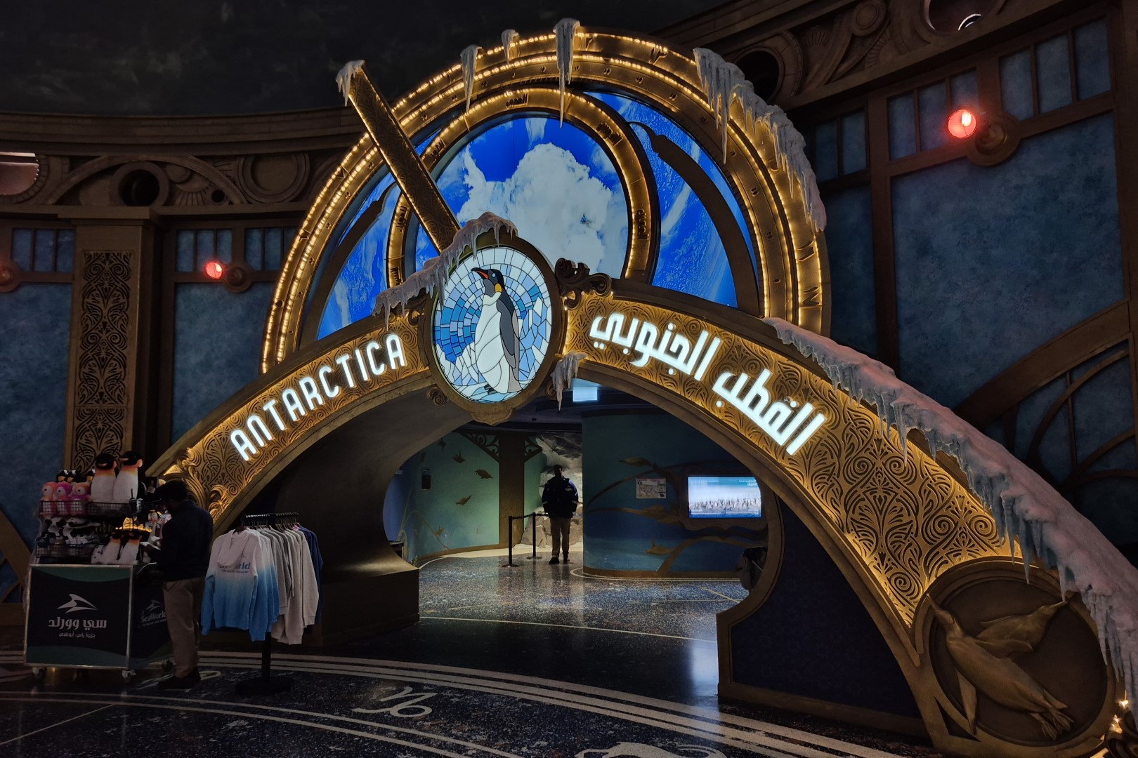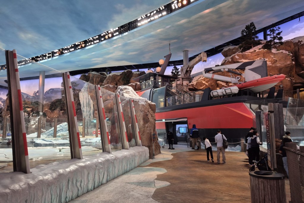 Is het in de moderne pretparkwereld een must om themagebieden toegankelijk te maken via portalen? Je zou haast denken van wel. Universal’s gloednieuwe Epic Universe maakt er gebruik van en ook in SeaWorld Abu Dhabi vinden we ze terug. One Ocean vormt de hub van waaruit je die verschillende portalen kan betreden. Een met ijs bedekte toegangspoort leidt ons bijvoorbeeld naar Polar Ocean, waar de koudste regionen van onze planeet gesimuleerd worden. Dat mag je vrij letterlijk nemen, want in de Antarctische zone schommelt de temperatuur rond het vriespunt. In een T-shirt vergt het dus doorzettingsvermogen om er rond te lopen, maar voor de pinguïns die er wonen is dit uiteraard business as usual. Tijdens ons (weliswaar korte) bezoek wandelen we door een rotsachtig landschap waarop een vers laagje sneeuw ligt. De pinguïnkolonie lijkt gewend aan menselijke aanwezigheid, dus we kunnen tot op enkele tientallen centimeters van de beestjes naderen. Het blijven ontzettend fotogenieke en interessante wezens, dus dit gedeelte van Polar Ocean is absoluut goedgekeurd. Als je er meer tijd wil doorbrengen, is het overigens wel slim om een jasje of trui mee te brengen.