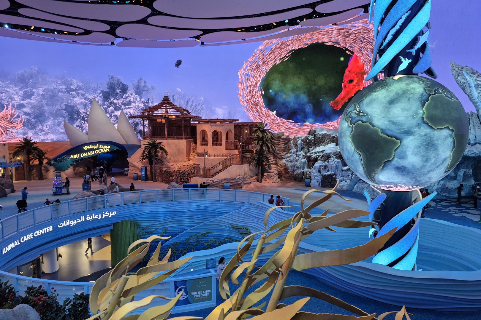 Een glazen aquariumtunnel verbindt Abu Dhabi Ocean met de volgende zone. Er komt net een zeeschildpad voorbij gezwommen wanneer we er doorheen wandelen en da’s behoorlijk indrukwekkend. Toch wordt dat gevoel enkele seconden later al ruimschoots overtroffen door een volgend wow-moment. Net zoals alle andere gasten worden we immers even stil wanneer One Ocean opdoemt. Deze gigantische ronde hal fungeert als het middelpunt van SeaWorld Abu Dhabi en men spaarde kosten noch moeite om daar een visueel pareltje van te maken. Blikvangers zijn een zacht ronddraaiende wereldbol en een reusachtig 360°-scherm. Door middel van haarscherp beeldmateriaal worden bezoekers een hele dag lang getrakteerd op een reis langs de wereldzeeën. De allermooiste beelden kregen bovendien een plekje in de One Epic Ocean Show, die op vastgestelde tijdstippen plaatsvindt. Dat spektakel blijkt best amusant, al is de duurtijd van veertien minuten misschien iets te lang.