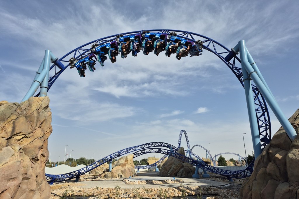 De trein passeert eerst een aquarium vol echte manta’s, waarna we de rest van de lay-out in de buitenlucht beleven. Met drie acceleraties, vier inversies en een totale tracklengte van 1,2 kilometer is Manta een rollercoaster van aanzienlijke proporties. Toch wil ik daarbij vertellen dat het sensatieniveau binnen de perken blijft. Soortgelijke banen als Taiga en Taron gaan voor gooi- en smijtwerk, maar bij deze helderblauwe coaster blijft het allemaal wat kalmer. Voor alle duidelijkheid: ik beschouw dat niet als een negatief punt. Manta wordt zelfs een van mijn favoriete rollercoasters in de Emiraten omdat er een ongelooflijk fijne flow in de lay-out zit. De baan combineert sterke bochtencombinaties, verrassende shotjes airtime en een aantal geslaagde inversies. Daarnaast is de soepelheid vermeldenswaardig en ik wil SeaWorld tevens complimenteren voor de aankleding van het buitengedeelte. De collega’s van Ferrari World bouwden hun achtbanen op kale en stoffige lapjes grond, maar hier razen de treinen rakelings langs rotsformaties en metershoge sculpturen van golven. Het levert niet alleen een aantal toffe near-misses op, maar ‘t is ook gewoon prettig om naar te kijken.