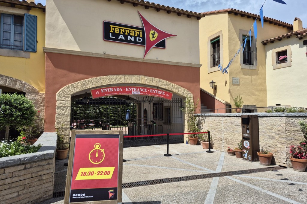 In het Mediterraanse gebied van PortAventura Park vinden we vervolgens een kleinschalige toegangspoort die ons naar Ferrari Land leidt. Gek genoeg is deze wereld van Ferrari niet onbeperkt toegankelijk voor hotelgasten. Je kan gedurende een hotelverblijf weliswaar eindeloos PortAventura Park en z’n zes themagebieden ontdekken, maar de toegang tot Ferrari Land is strikt gelimiteerd tot één keer. Hou tevens rekening met eerder ongebruikelijke openingstijden. Tijdens ons bezoek, dat nochtans tijdens het Spaanse hoogseizoen valt, is Ferrari Land bijvoorbeeld open van 16.30 uur tot 22.00 uur.