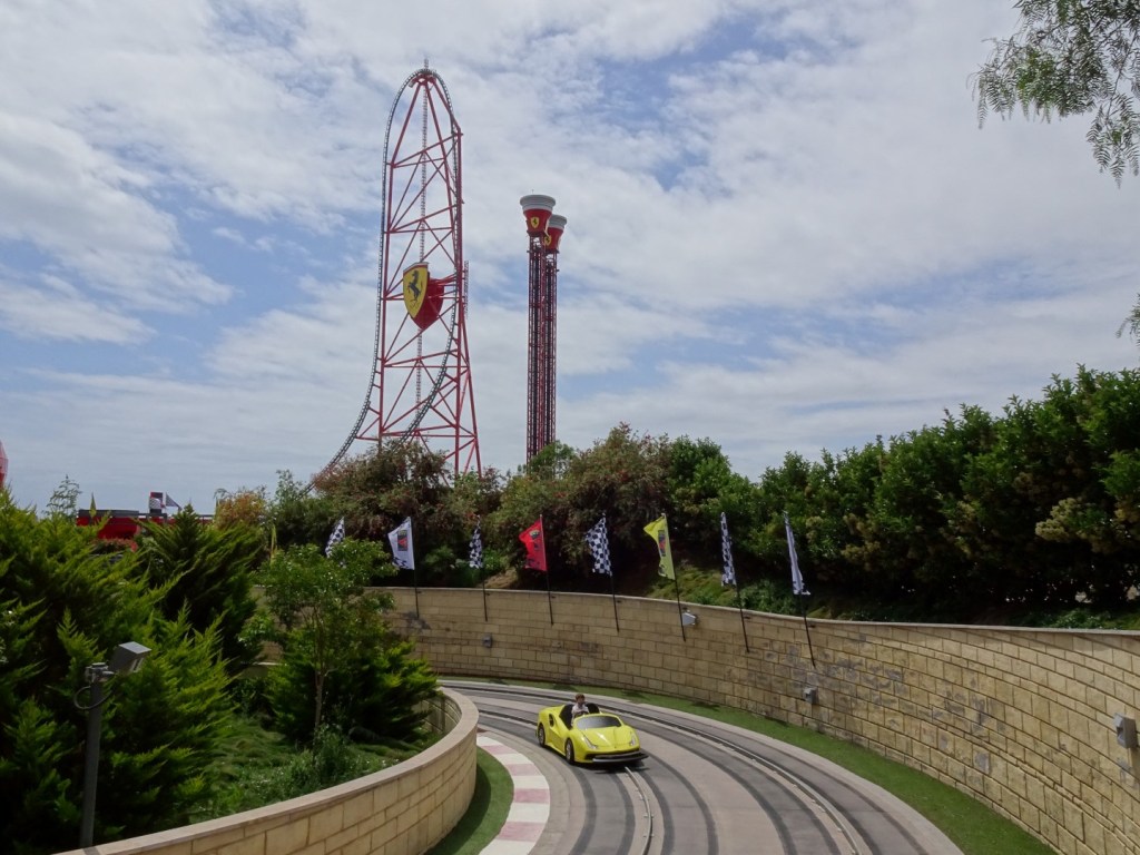 Roller Coaster Tycoon leerde me dat ieder zichzelf respecterend pretpark een zogenaamde rit in een karretje verdient. Ferrari Land ontsnapt niet aan die ongeschreven regel en bouwde daarom Maranello Grand Race. Bekijk dit als een lokaal alternatief voor Disney’s Autopia, inclusief de futuristisch ogende wagentjes, een hip stationsgebouw en de ellenlange wachtrij. Gelukkig voor ons prijkt er een nul op de wachttijddisplay en mogen we rechtstreeks instappen. Daarop volgt een aangename rit, die bovendien verrassend lang duurt. Toch ontbreekt bij deze attractie haast elke vorm van thema en detail. De omgeving wordt immers gedomineerd door beton en de kleur grijs. Meer dan een middelmatige familieattractie is dit bijgevolg niet. En als je jezelf afvraagt waarom ik Maranello Grand Race als een tweelingsattractie definieer, is hier het antwoord: de ride bestaat uit twee parallel lopende tracks. Racen tegen je vrienden en/of vijanden is hier dus perfect mogelijk.
