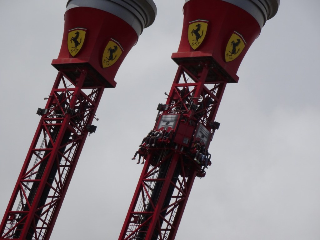 In PortAventura Park staan een paar attracties met erg originele namen. Voor pretparkfans klinken Shambhala, Volpaiute en Tutuki Splash wellicht als muziek in de oren. De ontwerpers van Ferrari Land hadden helaas minder tijd om namen te verzinnen voor hun rides. Een dubbele torenattractie Thrill Towers noemen… dat getuigt nu eenmaal niet van veel inspiratie. Ook de Engelse subnamen van deze beide torens (Bounce-Back Tower en Free Fall Tower) klinken een beetje knullig. Maar weet je wat het allerergste is? Het feit dat deze 55 meter hoge S&S-machines vlak naast Europa’s hoogste rollercoaster geplaatst werden. In de meeste parken zouden dergelijke rides best imposant ogen, maar hier lijkt het louter een simpele invulattractie. Wat mij betreft mag je hier gerust in een wijde boog omheen lopen, net zoals wij dat deden.