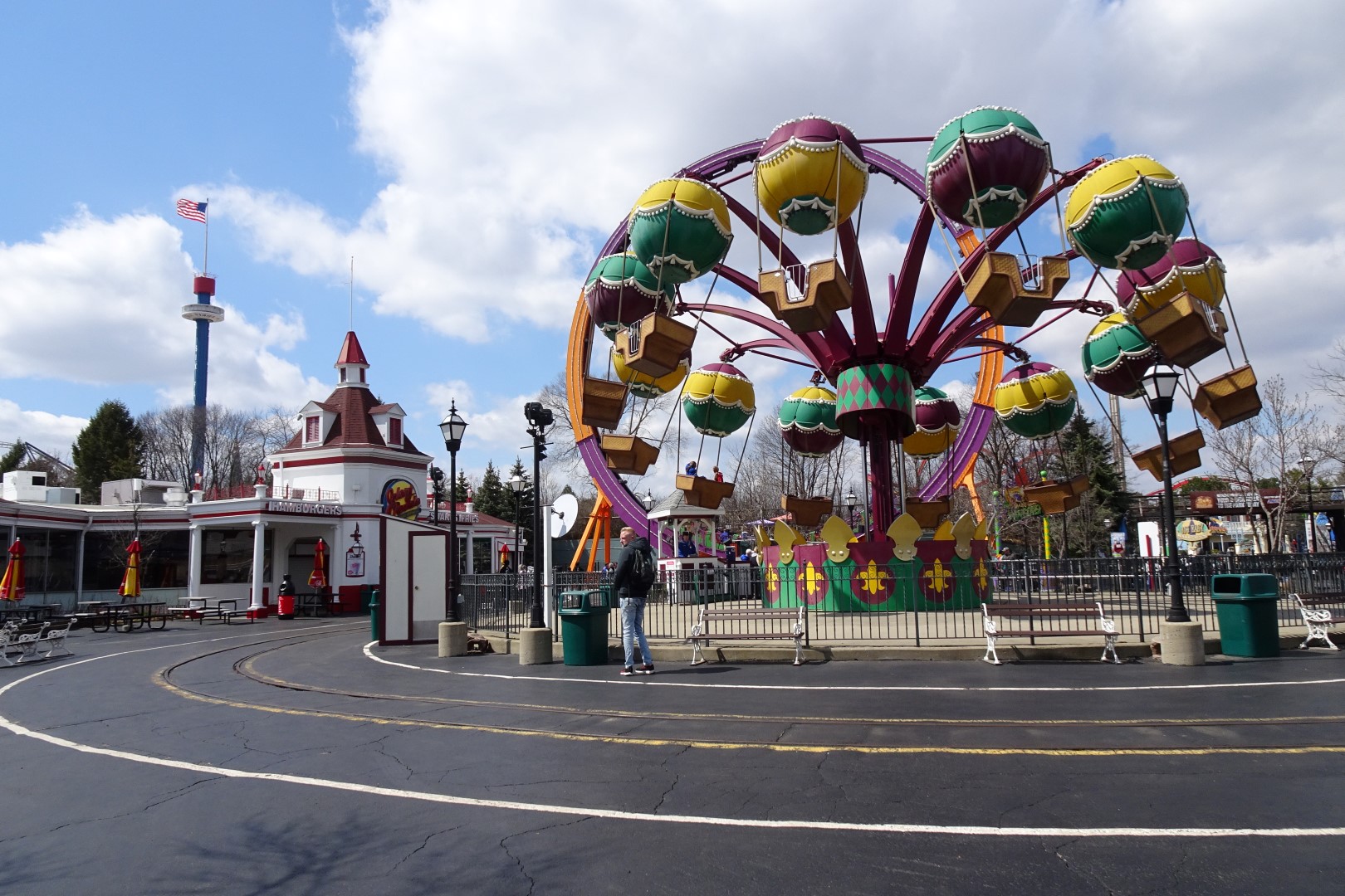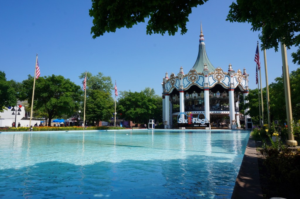 Een park met de naam ‘Great America’ hoort een flinke portie patriottisme uit te stralen. Dat begint al aan de toegangspoort, waar de Stars & Stripes trots wapperen aan de rand van een helderblauwe waterpartij. Je vindt in deze zone niet alleen de verplichte infobalies en souvenirwinkels, maar er staan ook twee attracties die ons aan de beginjaren van het park herinneren. Nummer één is de imposante Columbia Carousel, die vooral voor arriverende bezoekers een prachtige blikvanger vormt. Deze draaimolen is allesbehalve klein, maar toch wordt hij letterlijk overschaduwd door Sky Trek Tower. De 100 meter hoge panoramatoren staat centraal tussen Six Flags en waterparadijs Hurricane Harbor, dus onbetaalbare uitzichten op beide parken zijn zo goed als gegarandeerd. Op heldere dagen kan je in de verte zelfs Lake Michigan en de hoogbouw van Chicago spotten!