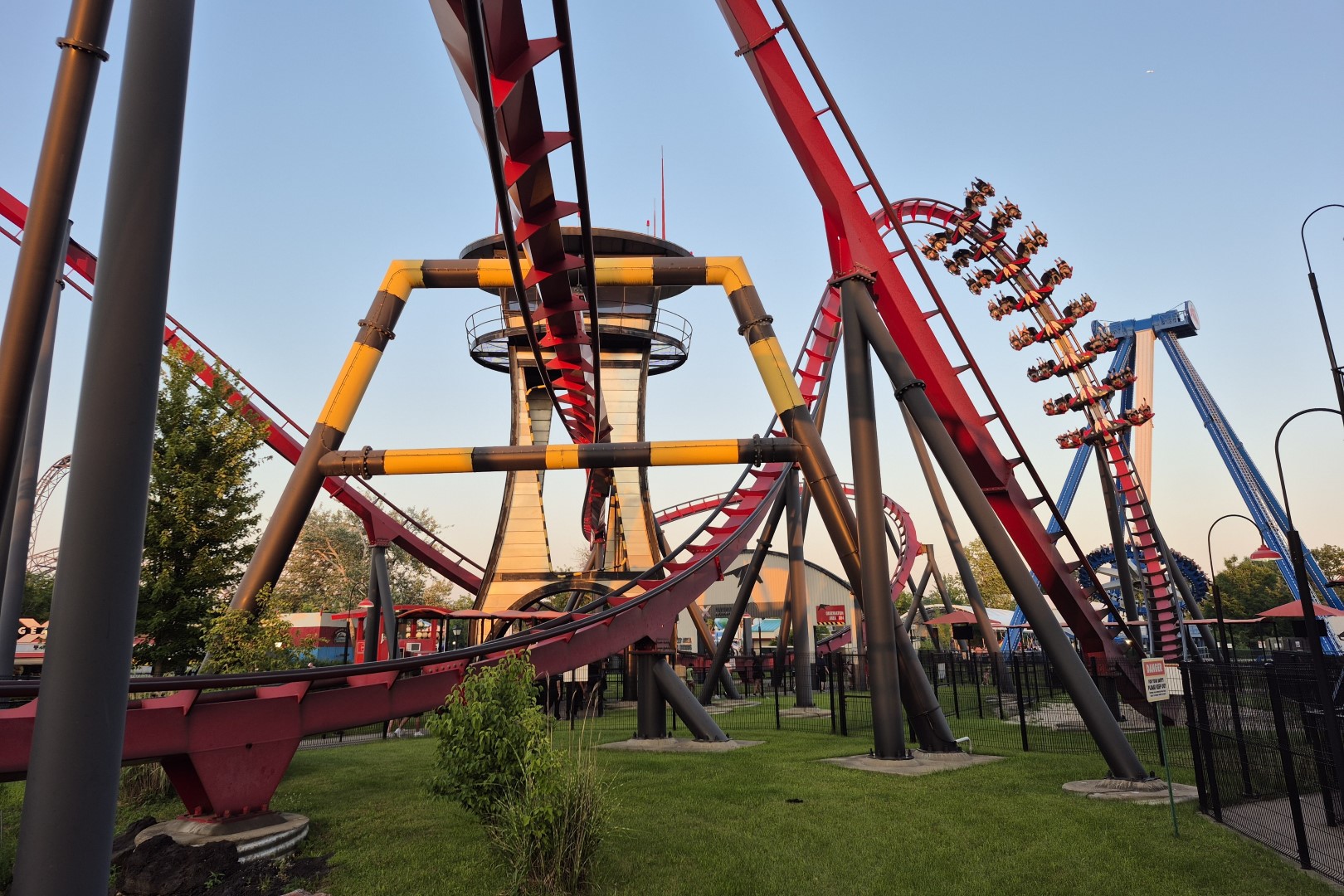 De hoogbejaarde Demon staat broederlijk naast Six Flags Great America’s nieuwste aanwinst. Dat is Wrath of Rakshasa, een B&M Dive Machine die tijdens het voorjaar van 2025 in première ging. Het ding hertekende niet alleen de skyline van Six Flags, maar de constructie van blauw en goud brengt ook heel wat extra dynamiek naar het centrale parkgedeelte. Verder mag ik Great America complimenteren met het toffe naambord, de hoge capaciteit en het uitstekende bagagesysteem, dat gebruik maakt van kisten die over het opstapplatform zweven. Maar… het is niet alleen maar rozengeur en maneschijn in het land van Rakshasa. Hoewel dit op het eerste zicht een van ‘s werelds meest complete en gevarieerde Dive Machines is, valt de rit me namelijk een beetje tegen. De eerste afdaling is weliswaar fantastisch, maar daarna zijn er toch wat minpuntjes te melden. Inversies nummer drie tot en met vijf zijn bijvoorbeeld redelijk gelijkaardig, waardoor de tweede helft van de rit een beetje eentonig aanvoelt. Bovendien ervaar ik tijdens meerdere elementen een ruwheid die er simpelweg niet hoort te zijn bij een nagelnieuwe B&M. Je hoort wel vaker dat de recentste installaties van deze Zwitserse constructeur niet meer voldoen aan de hoge kwaliteitsstandaard van vroeger, en ik begrijp nu helemaal waarom men dat zegt.