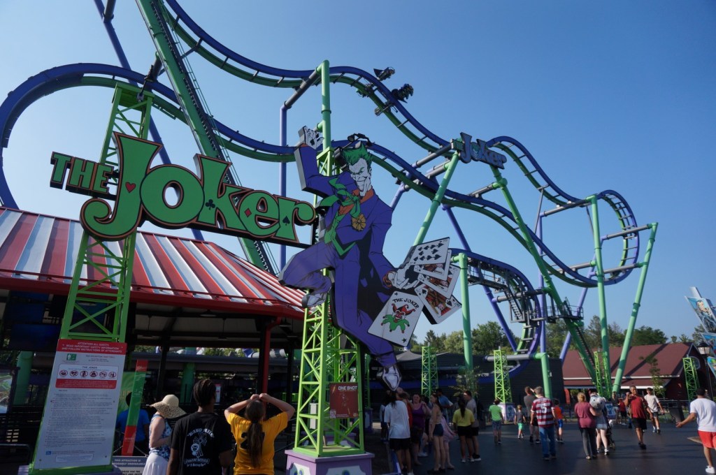 Geen enkele rollercoaster in DC Universe werkt volgens het gebruikelijke karretje-bovenop-de-baan-principe. Bij Batman en The Flash hingen we onder de tracks, terwijl passagiers bij The Joker naast de rails bungelen. Dit is namelijk – net zoals de naamgenoten in Six Flags Over Texas, Six Flags New England en Six Flags Great Adventure – een 4D Free Spin Coaster. Deze banen worden gekenmerkt door plotse draaibewegingen en een onvoorspelbaar aantal inversies, maar ik hou er niet van. Het voelt allemaal nogal geforceerd aan en de ritduur is belachelijk kort. Ik heb alleszins geen zin om er vanmiddag 40 minuten voor in de rij te staan, dus we laten Six Flags Great America’s versie van The Joker voor wat hij is.