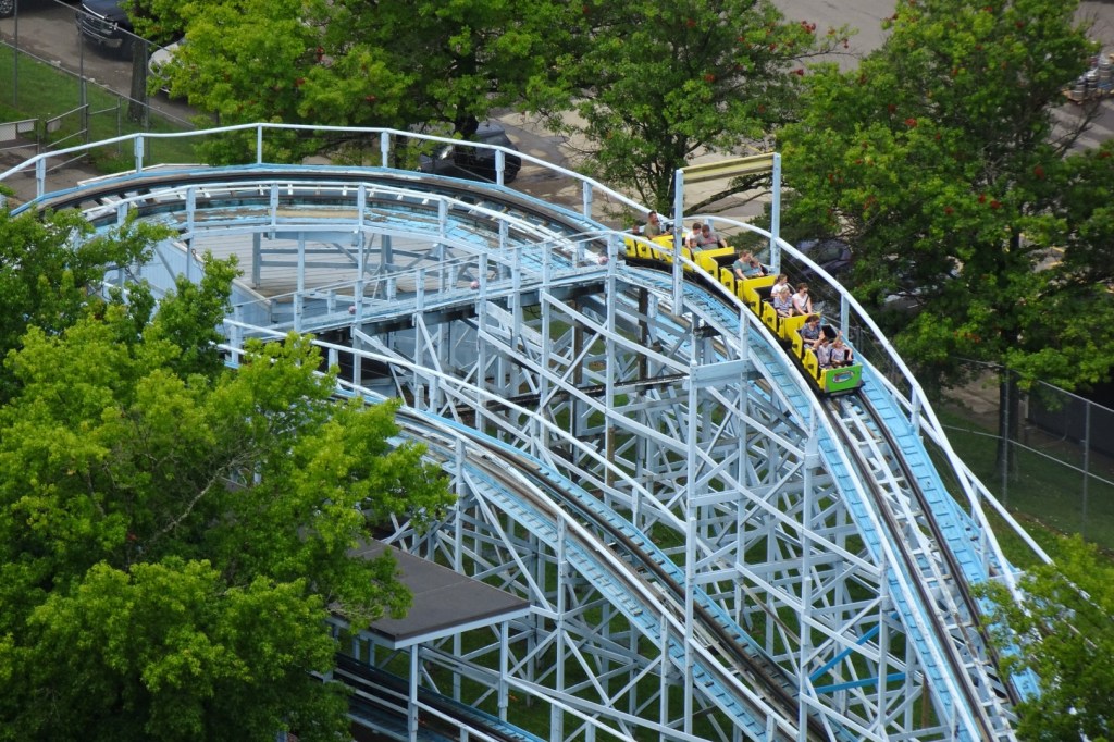 Net zoals Knott’s Berry Farm en Cedar Point heeft Kings Island een gigantische zone waarin Snoopy en de Peanuts centraal staan. Je vindt er souvenirwinkels vol (redelijk dure) merchandising, een leuk gedecoreerde boomstammenbaan, meerdere molens en een schattige monorail met kleine vliegtuigjes. Daarnaast bevat de Snoopy-zone maar liefst vier rollercoasters die geschikt zijn voor de hele familie. The Great Pumpkin Coaster is het kleinste exemplaar. De lay-out is een doodeenvoudig ovaal en de maximale hoogte bedraagt – hou je vast – tweeënhalve meter. Dit kleuterspeeltuig slaan we dus over, maar de nabijgelegen Woodstock Express verdient wel een bezoek. Dit is een helderblauw geschilderde, ruim vijftig jaar oude familieachtbaan van Philadelphia Toboggan Coasters. Hoewel het cijfermateriaal niet bepaald veelbelovend is, ervaren we hier wel het authentieke gevoel van een woodie. Woodstock Express doet me dankzij de gelijkaardige lay-out trouwens nostalgisch terugdenken aan Pegasus in de Efteling.