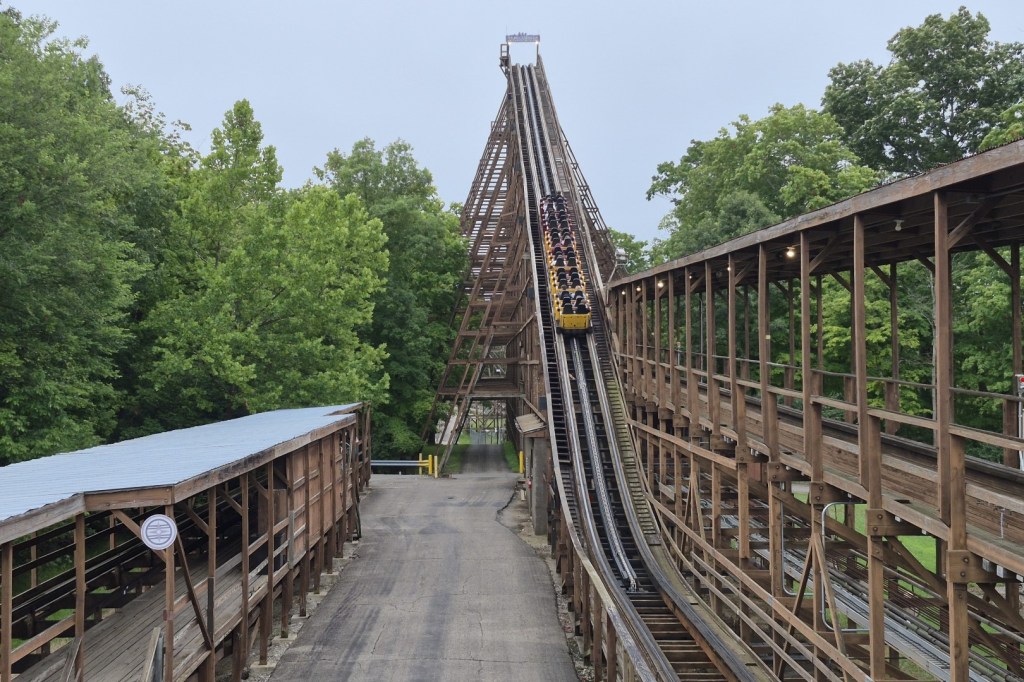 We ontdekken in The Beast een rollercoaster met twee gezichten. Eerlijk gezegd: na de first drop gebeuren er geen al te spectaculaire dingen. De trein behaalt weliswaar een stevige topsnelheid, maar dit eerste stuk van de lay-out bestaat uit zeer wijde bochten, zachte dalingen en baangedeelten die wielrenners als vals plat zouden categoriseren. Achter lifthill nummer twee ligt echter een van de heftigste achtbaangedeeltes die ik ooit beleefde. Een lange afdaling leidt hier immers naar een haast eindeloze, buitengewoon intense helix. We vliegen er met een rotvaart doorheen en krijgen onderweg behoorlijk wat turbulentie te verduren. In de slotrem moeten we dus even bekomen van het brute geweld, maar ik kan dat wel waarderen bij een woodie uit het jaar 1979. The Beast is een icoon en ik vind het een eer om deze baan eindelijk aan m’n achtbaanteller te kunnen toevoegen.