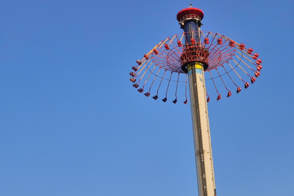 De puike decoratie van Adventure Port staat in schril contrast met de verschijningsvorm van de aangrenzende Action Zone. Het vele beton geeft een kille uitstraling en het merendeel van de attracties heeft nul komma nul theming. Voor thrillseekers is het echter onmogelijk om dit parkgedeelte te vermijden, want er valt veel sensatie te rapen. We vinden er een Giant Frisbee van Huss, een bijna 100 meter (!) hoge vrijevaltoren van Intamin en de laatste overgebleven Invertigo in de Verenigde Staten. Dit is een inverted-versie van Vekoma’s Boomerang, net zoals de versies in Parc Bagatelle en het Italiaanse Movieland. Ik loop altijd in een wijde boog om klassieke Boomerangs heen en deze variant kan me evenmin overtuigen om een ritje te maken.