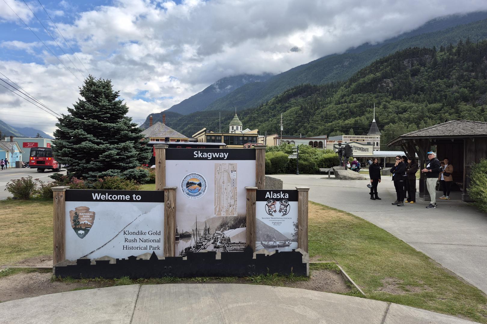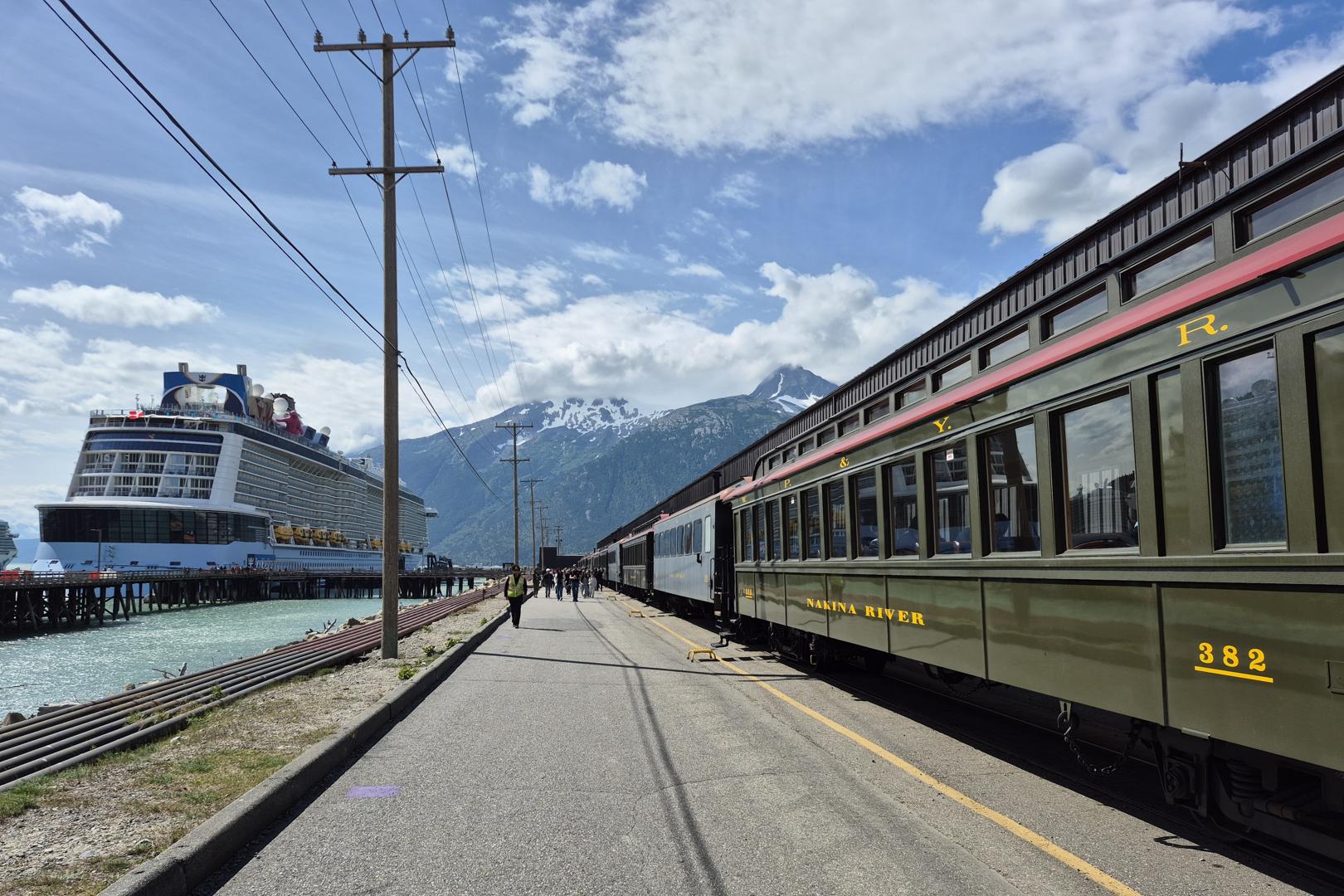 De volgende ochtend arriveren we voor dag en dauw op het meest noordelijke punt van onze reis. Skagway ligt aan het noordelijke eind van de Inside Passage en wordt omgeven door imposante bergtoppen. Wanneer de Quantum het dok nadert, wordt duidelijk dat we niet de enige toeristen zijn die hun dag in Skagway doorbrengen. Drie andere boten zijn al aangemeerd en één daarvan is geen onbekende. We spotten immers meteen de Disney Wonder, een schip dat me in 2014 mijn eerste cruise-ervaring bezorgde. De Wonder lijkt plots piepklein wanneer Quantum of the Seas ernaast geparkeerd wordt, maar ik kijk toch met een klein beetje jaloezie naar de reizigers die deze week met Disney Cruise Line mogen doorbrengen.