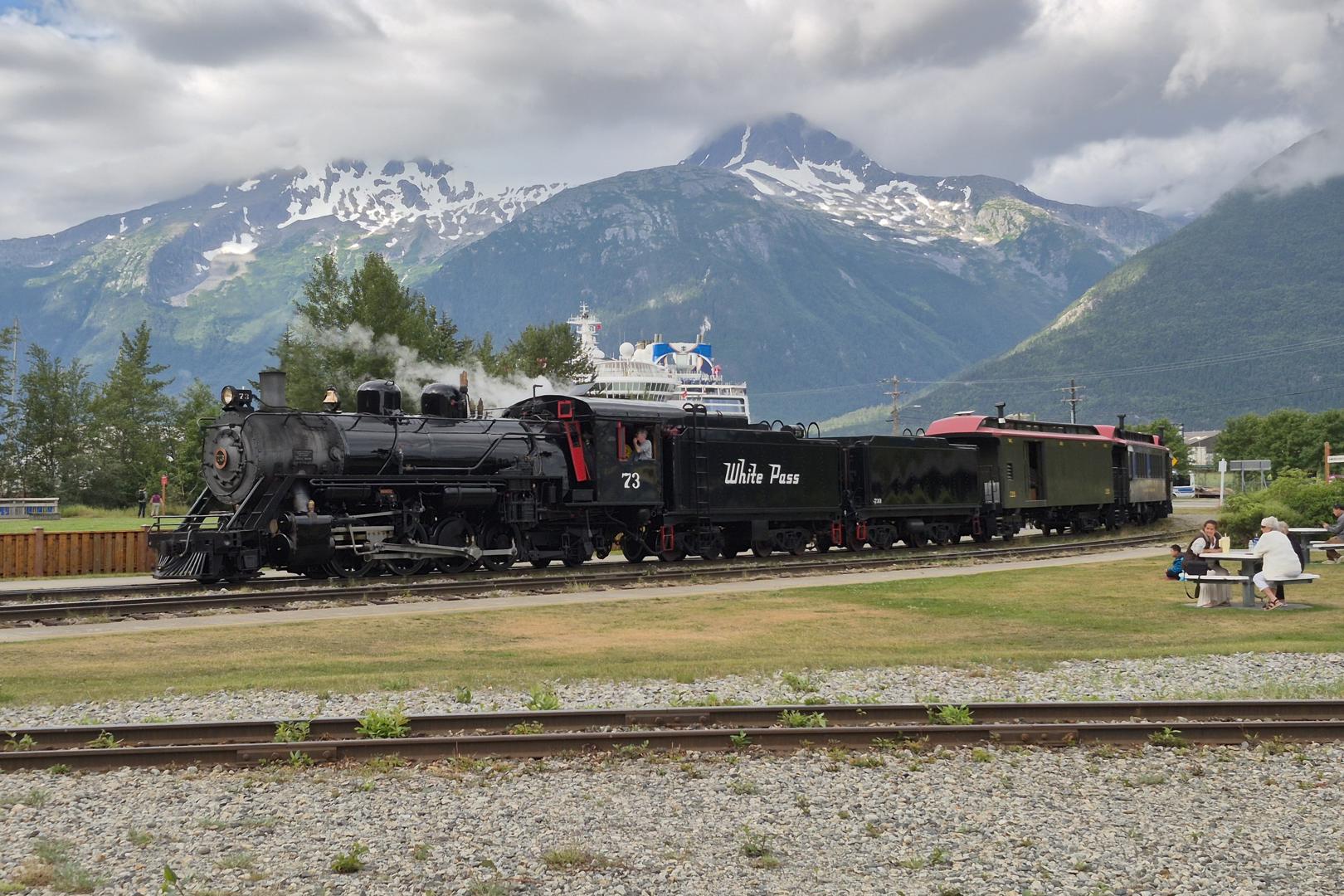 Wanneer het over Disneyland gaat, denk ik automatisch aan een stoomtrein. En toeval of niet… De grootste toeristische trekpleister van Skagway is de White Pass & Yukon Route Railway. Deze trein, die letterlijk naast de aanlegplaats van ons schip vertrekt, wordt door zowat iedere reisgids als een must-do bestempeld. Het spoor verbindt Skagway met Whitehorse, de hoofdstad van het Canadese Yukon-territorium. De afstand tussen beide steden bedraagt bijna 200 kilometer, al is er voor toeristen gelukkig een drastisch ingekorte variant. We gaan vanmiddag aan boord voor een rit van ongeveer drie uur. We leggen daarbij de eerste 33 kilometer van de White Pass Railway af en overbruggen een hoogteverschil van bijna 900 meter.
