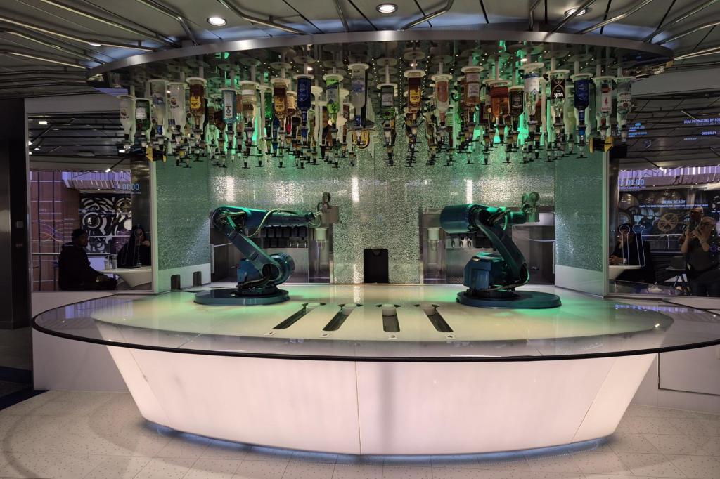 Drinken kan in tientallen etablissementen, waaronder een wijnbar, een Ierse pub, een pianolounge, meerdere poolbars en allerlei zaken langs de Royal Promenade. Onze aandacht wordt echter vooral getrokken door de Bionic Bar. In deze lounge worden de cocktails niet gemixt door een klassieke barman, maar wel door twee high-tech robotarmen. Ze vullen de maatbekers met grootste precisie en shaken op elegante wijze ons drankje tot de perfectie. Het is heerlijk om naar te kijken en behoorlijk Instagram-waardig, maar de prijs is navenant. En jammer maar helaas: je ontsnapt niet aan de Amerikaanse tipping-cultuur, want zelfs die volautomatische Kuka-armen verwachten een fooi van 18 procent.