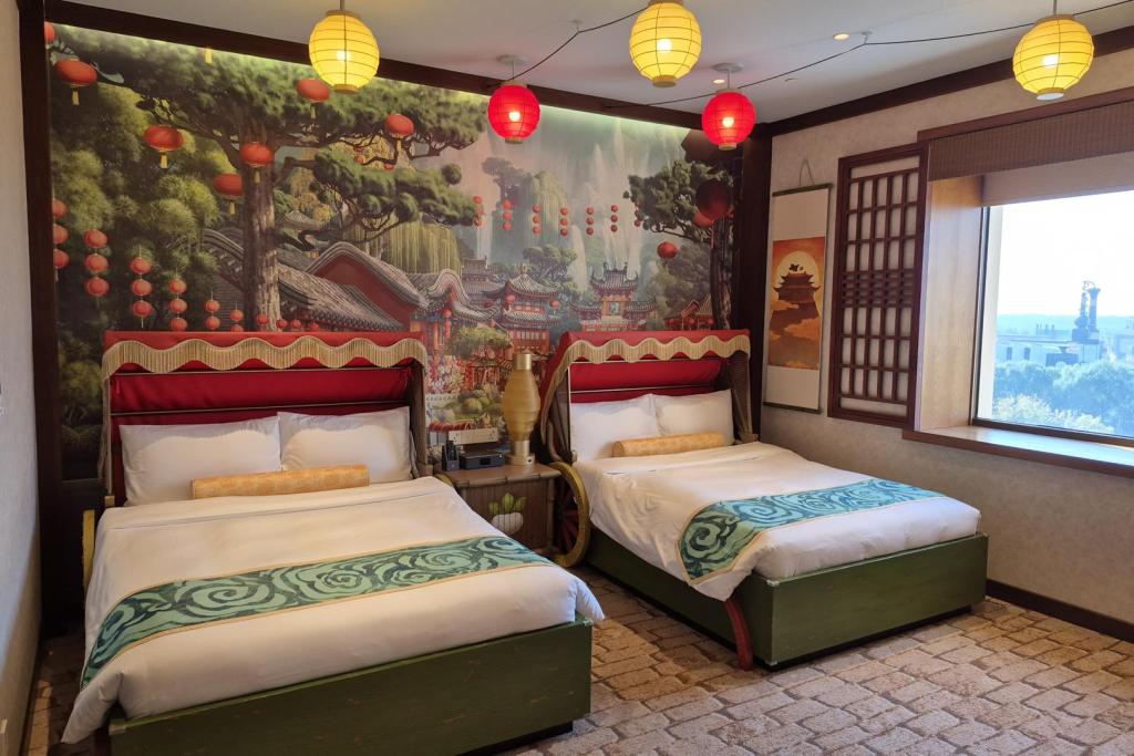 Een on-site verblijf is geen must om ten volle van Universal Beijing te genieten. Toch maakt zo’n nacht in een themaparkhotel een trip altijd wel completer. We zijn dus blij dat we vanochtend mogen inchecken bij The Universal Studios Grand Hotel, dat zich letterlijk boven de ingang van Universal Studios Beijing bevindt. Het statige hotelgebouw maakt de aankomst voor dagjesbezoekers indrukwekkender, maar de echte pracht en praal zit achter de façade. De lobby, de bars en de restaurants transporteren ons naar de gouden dagen van het Hollywood-tijdperk, terwijl er achter de kamerdeuren uiteenlopende Universal-films tot leven gewekt worden. Onze kamer baadt bijvoorbeeld helemaal in het thema van Kung Fu Panda. De bedden zijn vormgegeven als riksja’s en het plafond werd gedecoreerd met een tiental kleurrijke lampions. Naast deze leuke decoratie worden we aangenaam verrast door een zee van ruimte (een groot contrast met de gemiddelde hotelkamer in Azië) en het fijne uitzicht op Universal CityWalk.