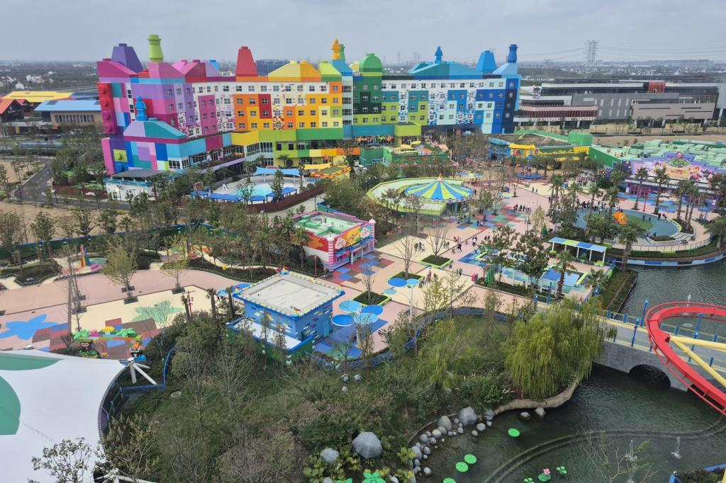 Onze eerste indrukken van Legoland Shanghai Resort worden geleverd door Aegean Bingo, een winkel- en entertainmentzone. Voor alle duidelijkheid: dit is een dertien-in-een-dozijn mall zonder theming. Ik had omwille van de naam misschien een paar verwijzingen naar Griekenland of de Egeïsche Zee verwacht, maar die vinden we helaas niet. Tijdens ons bezoek loopt er in Aegean Bingo bovendien nauwelijks volk rond, waardoor we het als een tamelijk kille plek ervaren. Gelukkig zien we al vlug meer vrolijkheid wanneer het Legoland Shanghai Hotel opdoemt. Dit kleurrijke hotel bevat 250 kamers en doet eveneens dienst als de toegangspoort van het themapark. Wij verblijven er zelf niet, maar ik kan me voorstellen dat de slaapkamers aan de parkzijde een erg fijn uitzicht te bieden hebben.