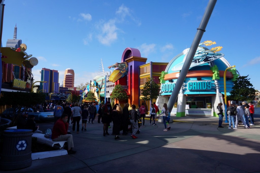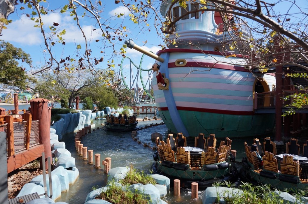 Het voelt gek om te weten dat het januari is, terwijl we met een aangenaam zonnetje en 27 graden door het park kuieren. Toch kan je hierdoor duidelijk de locals van de toeristen onderscheiden. Bezoekers uit Florida vinden deze temperaturen blijkbaar winters genoeg om een dikke jas en sjaal te dragen, terwijl een aantal toeristen zich alsnog aan de waterattracties van Toon Lagoon wagen. Ik moet toegeven dat ik mezelf bij het kamp van de niet-durvers indeel. Hoewel ik met zulke weersomstandigheden heus niet bang ben van een spatje water, zijn Dudley Do-Right’s Ripsaw Falls en Popeye & Bluto’s Bilge-Rat Barges simpelweg te natmakend. Deze boomstammenbaan en rapid river worden vaak bij de meest legendarische versies in hun categorieën gerekend en je verlaat ze sowieso met kletsnatte kledij. Ik ben vol bewondering voor diegenen die deze waterexpedities wel ondernemen, maar wij beperken ons vanmiddag tot kijkplezier van op de droge oever. Wanneer er bij de droogcabines een meterslange rij verkleumde wachtenden ontstaat, beseffen we dat we de juiste keuze maakten.