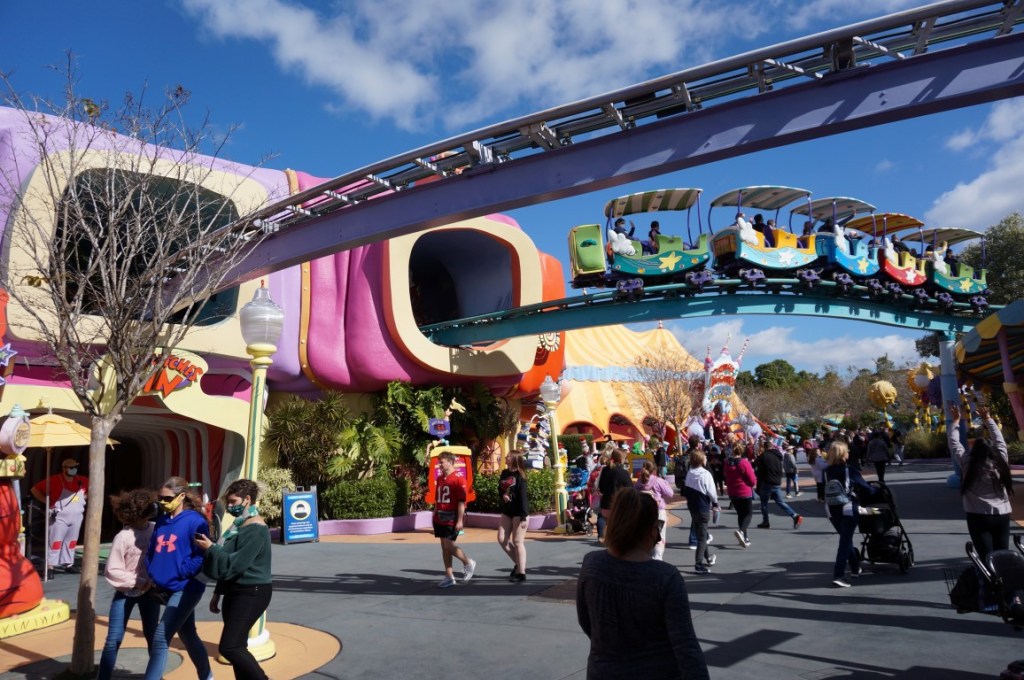 Themagebied Seuss Landing is kleurrijk en zit boordevol dynamiek, maar we brengen er niet al te veel tijd door. Deze zone is namelijk vooral op jonge kinderen gericht, iets wat zich weerspiegelt in het attractieaanbod. Moet je dit gebied dan gewoon overslaan? Neen, in mijn ogen niet. The High in the Sky Seuss Trolley Train Ride blijkt een vermakelijke rondrit en de zogenaamde Caro-Seuss-el is een lust voor het oog. Als liefhebber van darkrides kan ik trouwens ook The Cat in the Hat warm aanbevelen. Dit is namelijk een verrassend lange rondrit waarin de verschillende scènes aan elkaar gepraat worden met grappige rijmpjes. Hoewel het personage van Dr Seuss me helemaal onbekend is, tovert deze vrolijke familieattractie een gemeende glimlach op m’n gezicht. Het feit dat er zelden wachtrijen staan, is mooi meegenomen.