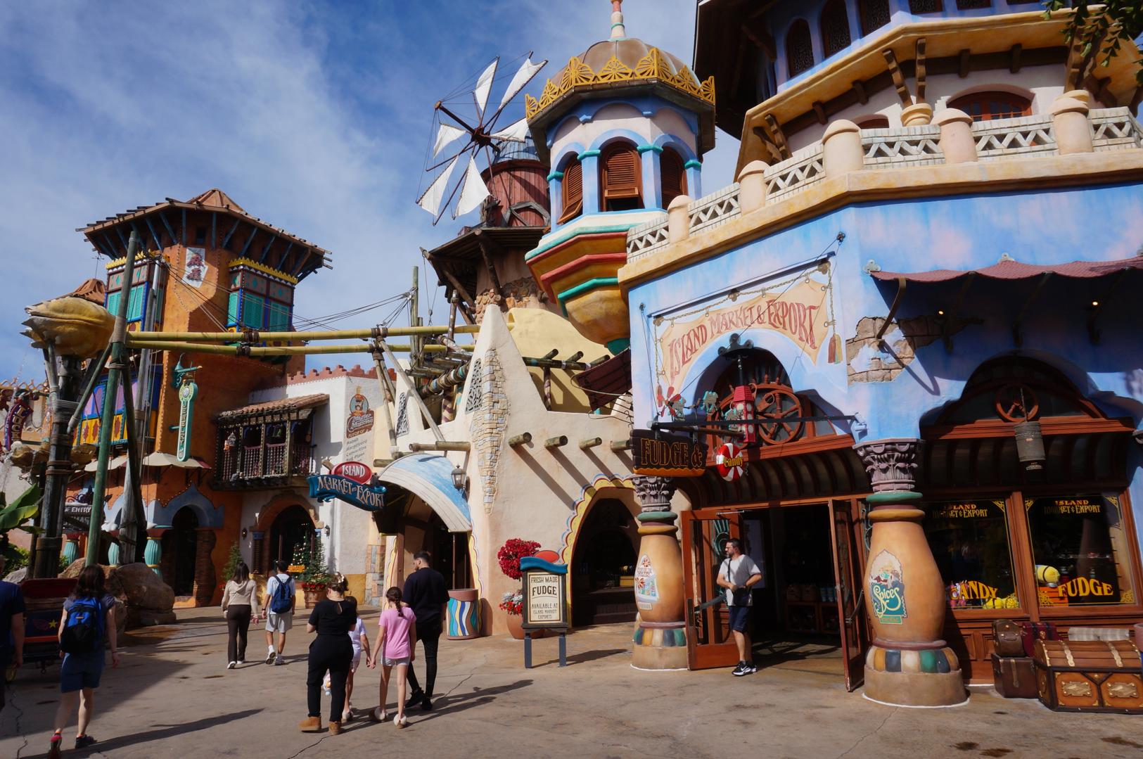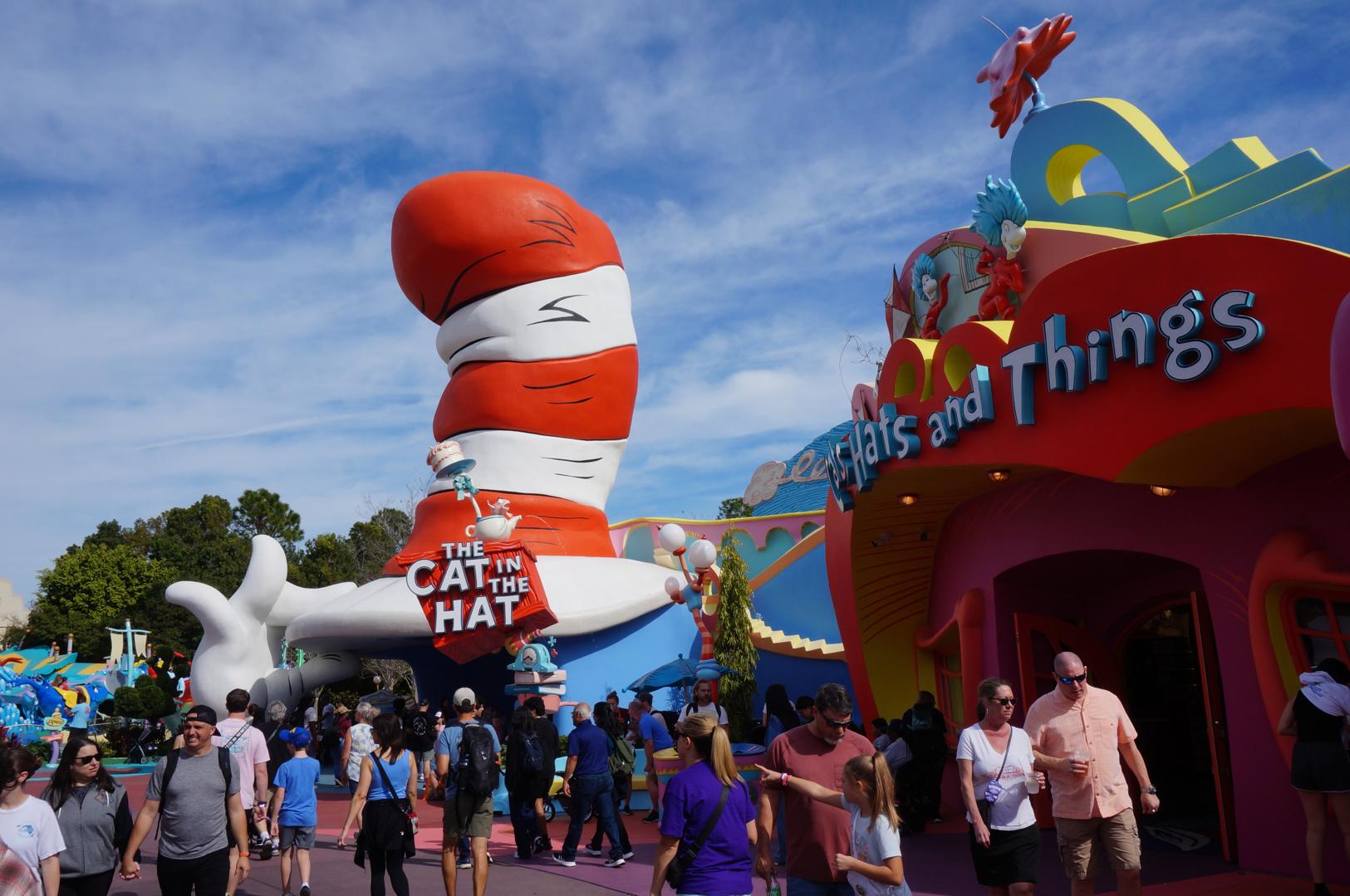 Themagebied Seuss Landing is kleurrijk en zit boordevol dynamiek, maar we brengen er niet al te veel tijd door. Deze zone is namelijk vooral op jonge kinderen gericht, iets wat zich weerspiegelt in het attractieaanbod. Moet je dit gebied dan gewoon overslaan? Neen, in mijn ogen niet. The High in the Sky Seuss Trolley Train Ride blijkt een vermakelijke rondrit en de zogenaamde Caro-Seuss-el is een lust voor het oog. Als liefhebber van darkrides kan ik trouwens ook The Cat in the Hat warm aanbevelen. Dit is namelijk een verrassend lange rondrit waarin de verschillende scènes aan elkaar gepraat worden met grappige rijmpjes. Hoewel het personage van Dr Seuss me helemaal onbekend is, tovert deze vrolijke familieattractie een gemeende glimlach op m’n gezicht. Het feit dat er zelden wachtrijen staan, is mooi meegenomen.