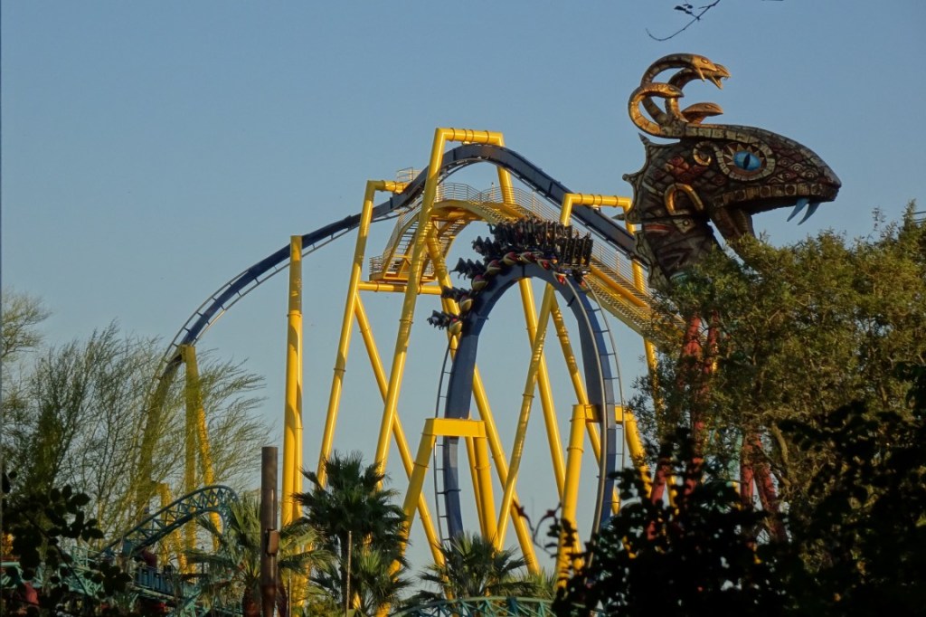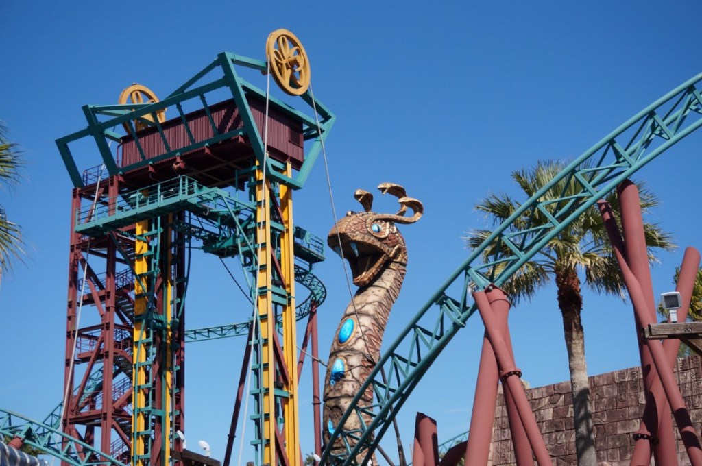 Since my previous visit to Busch Gardens Tampa three new credits were added to the lineup. Unfortunately, I wasn’t able to ride them all, as Cobra’s Curse remained closed. This closure wasn’t indicated on the park’s maintenance calendar, so it felt a little disappointing. I would’ve loved to ride this spinning coaster from Mack Rides, as it has a custom layout, a vertical lift and unique trains. In addition, Cobra’s Curse seems to be Busch Gardens Tampa’s best-themed roller coaster. Its eye-catcher is a 20-metre tall, gold-coloured cobra statue.