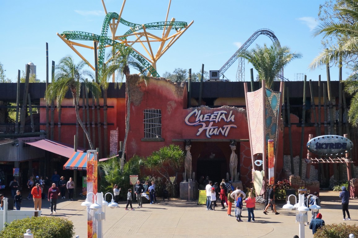 Despite its central location, Iron Gwazi is virtually invisible from many pathways in the park. I found this unfortunate, especially from a photographic point of view. Fortunately, most other coasters in this park are a lot more photogenic. Cheetah Hunt, for example, races picturesquely through Busch Gardens’ savannah. Cheetah Hunt opened in 2011 and it was quite innovative at the time. After all, there weren’t that many multi-launch coasters back then, and the layout of this ride was rather unusual (even by today’s standards). Its most notable element is the curious-looking tower construction after acceleration number two, but this turned out to be one of the least spectacular moments for riders. The following part of the layout, which winds through the savannah like a cheetah, is considerably punchier. However, keep in mind that Cheetah Hunt shouldn’t be considered as a huge thrill. While this coaster does contain an inversion and it achieves a fairly high speed, it’s mostly an advanced family roller coaster.