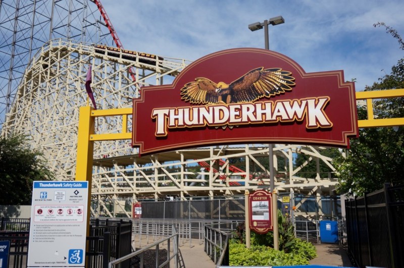Dorney Park’s oldest coasters are Thunderhawk and Steel Force. Their age difference is considerable, though. Steel Force was presented in 1997 and wooden coaster Thunderhawk opened more than 70 years earlier! Despite its respectable age, Thunderhawk made a good impression. I expected it to be a very rough and uncomfortable, but it definitely wasn’t.