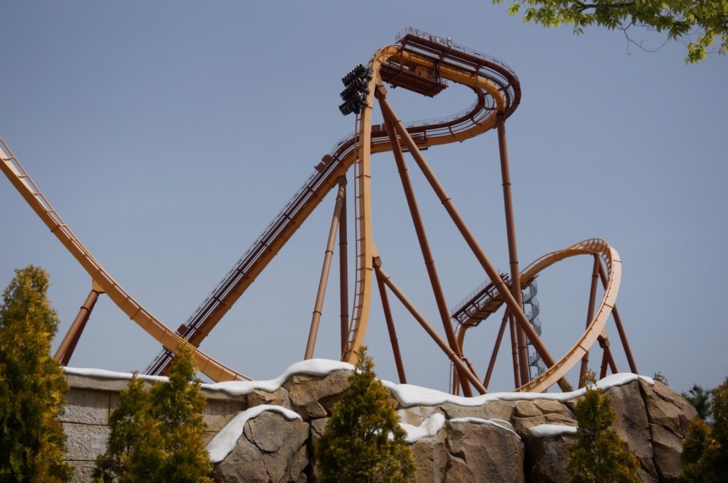 Flat ride lovers will find everything they’re looking for at Gyeongju World. The park offers a Zamperla Air Race, a classic Frisbee, a 70-metre tall free fall tower, an Afterburner and a (surprisingly popular) swinging ship named King Viking. And if you’re visiting during the summer months, there are plenty of ways to cool down. Gyeongju World offers a pool area with some slides and the park is home to the holy trinity of water rides. This includes a very tall shoot-the-chutes, a log flume and a rapid river. Especially the rapid river looks pretty cool. This ride is called Grand Canyon Exploration and it features some impressive rockwork.