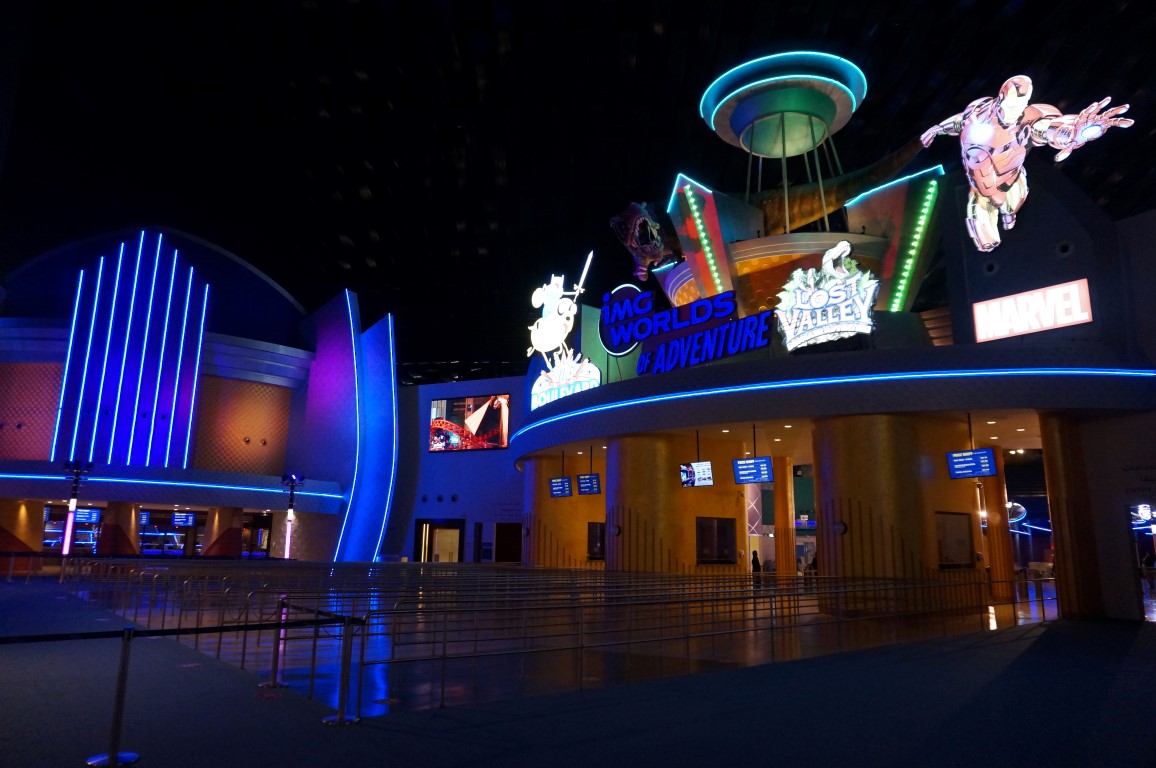 Let me take you to the City of Arabia, a part of Dubailand. When Dubailand was presented, it was supposed to become the largest entertainment resort on the planet. Move over, Walt Disney World, Dubailand will soon have more theme parks, hotels, water parks and restaurants. Or at least… that was the plan. Unfortunately, the project was far too ambitious to become a reality. And when the United Arab Emirates encountered a major economic crisis in 2008, most of the Dubailand plans were cancelled. However, a project called IMG Worlds of Adventure wasn’t cut and it was completed in 2016. At opening, IMG Worlds became the world’s largest indoor theme park. And although that world record has been taken over by Warner Bros World Abu Dhabi in 2018, IMG Worlds remains an incredibly large venue. It features a cinema and an amusement park with 4 themed lands. Air-conditioning is active, so this park can even provide an enjoyable day during the hottest days of the Arabian summer.