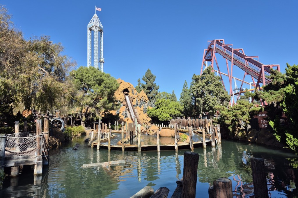 To say that California has a pleasant climate is actually still an understatement. Although we visit the park in autumn, we still enjoy temperatures of up to 28°C. This means that there’s little reason to skip Knott’s water rides, even if the selection is not that wide. The legendary Perilous Plunge closed over a decade ago and the local rapid river was undergoing a refurbishment at the time of our visit. The only remaining option was Timber Mountain Log Ride, an excellent log flume. The ride is not only surprisingly long, but also includes extensive dark ride sections with animatronics. We are treated to two amusing drops, which (thankfully) don’t get us as wet as Tiana’s Bayou Adventure did yesterday. Despite being one of the world’s oldest log flumes, Timber Mountain Log Ride counts as one of the must-do attractions at Knott’s Berry Farm.