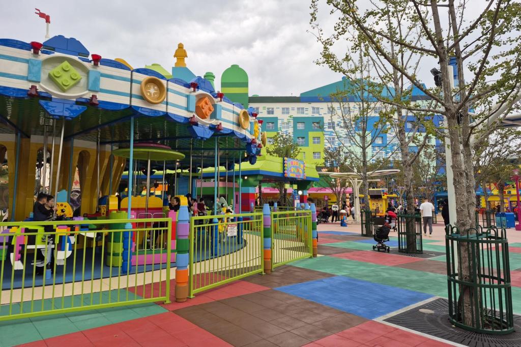 The first thing you’ll notice when approaching Legoland Shanghai Resort, is Aegean Bingo, a retail and dining zone. To be clear: this is an unremarkable mall without the slightest form of theming. Given the name, I might have expected a few references to Greece or the Aegean Sea, but I didn’t find any. Besides, Aegean Bingo was virtually empty during our visit, which made it feel like a rather boring place. Fortunately, the adjacent Legoland Shanghai Hotel looked considerably more cheerful. This colourful hotel has 250 rooms and it also serves as the entrance to the theme park. We didn’t stay there ourselves, but I can imagine that the bedrooms on the eastern side offer some very nice views of the park.