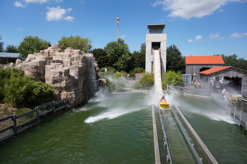 Another eye-catching ride is called Splash-O-Saure. This log flume has a vertical elevator and it was elaborately themed to dinosaurs. And yes, I know that every theme park seems to be building a dinosaur-themed ride nowadays. Still, Parc du Bocasse did a great job and the long queues prove that it’s a crowd-pleaser. In 2021, the dinosaur area was expanded with a new Vekoma family coaster.