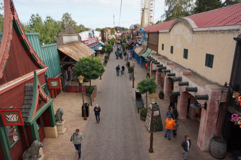 One particular thing that I like about Attractiepark Slagharen, is its Main Street. The park is shaped like an hourglass, with the Main Street being the middle piece of it. That’s why the Main Street is literally in the centre of the park and it remains a busy shopping and dining hub throughout the day. Those who feel too lazy to walk the full length of Main Street, can use the cable car soaring above it.