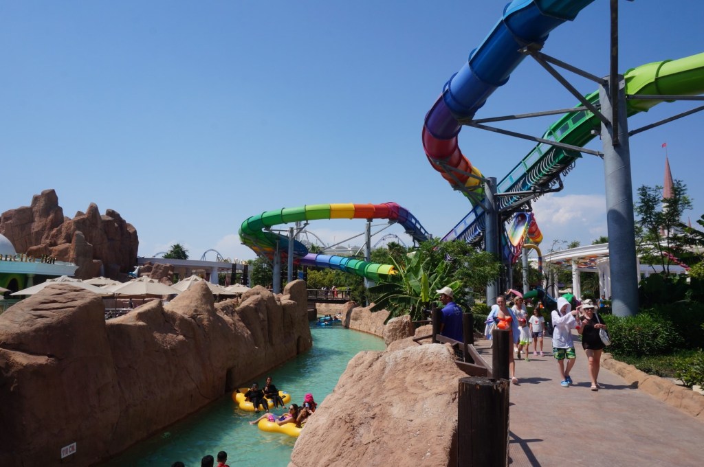 You don’t need a ticket to enter Shopping Avenue. For the other sections of Land of Legends, however, there’s an admission fee. A ticket is not cheap: online prices range between 70 and 90 euros, while you’ll pay a whopping 100 euros on-site. Fortunately, you get quite a lot in return. After all, The Land of Legends Theme Park is huge and it consists of four parts. Parts one and two are Aqua Park and Tropic Lagoon, which together form an impressive water park. Thanks to its exotic vegetation and the wide selection of attractions, this water park makes an excellent impression. Thrillseekers will find a lot of spectacular slides, but families with young children aren’t forgotten either. The most popular attraction of the entire water park turns out to be the Turtle Coaster, named after its turtle-shaped station. This water coaster is nearly half a kilometre long and it mainly stands out because of its rainbow-like colour scheme. A little patience is required, though. The wait time for Turtle Coaster hovered around 60 minutes, while most of the other slides had nonexistent queues.