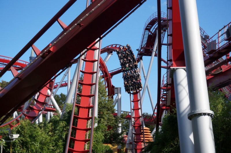 Tivoli Gardens’ most thrilling roller coaster is Dæmonen. It’s definitely not a mammoth, though. This is one of the smallest, most compact B&M projects ever. Dæmonen is about half a kilometer long, it’s 30 metres tall and it contains three inversions. That doesn’t sound impressive, but this coaster still guarantees a good dose of adrenaline. The tight layout generates nice g-forces and the inversions are pretty intense. Unfortunately, the whole ride is dominated by roughness. It’s not overly annoying, but Dæmonen is a shakier than you would expect from a B&M that was built in 2004. On a brighter note, this coaster looks absolutely stunning in the Chinese section of Tivoli.