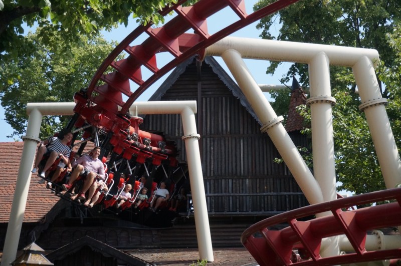 During my visits, I noticed that one particular ride gets long queues during the day: Kvasten. That’s why we usually make this Vekoma family coaster our first priority in the morning. Kvasten’s main issue is the capacity. There’s only one train for 20 passengers, which is obviously insufficient for a ride this popular. Kvasten is a fine inverted coaster with a good layout and a smooth ride experience, so basically everyone wants to ride it. A second train would be greatly appreciated, but that’s not possible due to the lack of an extra brake section.
