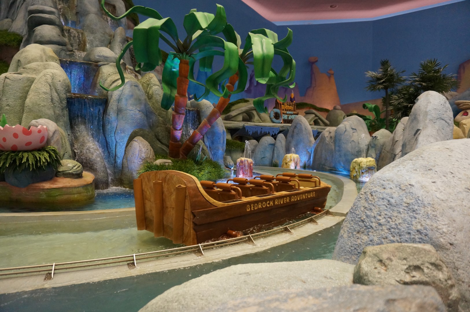 The contrast between the left and the right half of the park is enormous. I consider that as a positive thing. If you’ve had enough of the dark and aggressive atmosphere on the left side, you can easily cross over to the cartoon world on the other side. And after witnessing all those superhero stories, it sure is a relief to enter Bedrock. This colourful zone was based on The Flintstones. The atmosphere is therefore prehistoric and refreshing. Both of these adjectives also apply to the main ride in this area: Bedrock River Adventure. With this flume ride, Warner Bros World has tried to imitate Splash Mountain and they actually did a great job. I admit that this Flintstones version is much smaller and it could use an extra drop, but the dark ride section looks perfect. Excellent family attraction, if you ask me.