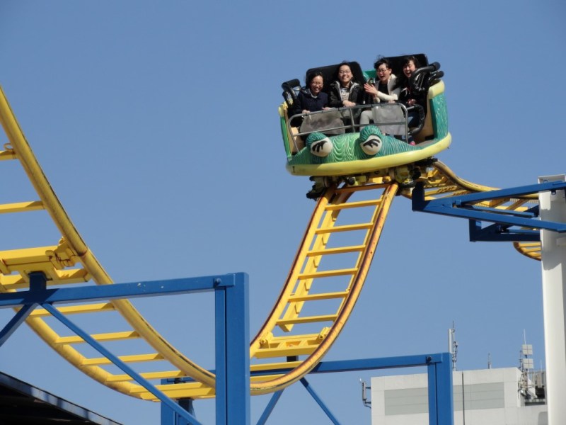 A total of three credits are currently operating at Yokohama Cosmoworld. Two of them aren’t special at all. Family Banana Coaster has a cute monkey and banana theme, but the ride is meant for young children. Spinning Coaster is a classic Reverchon model, just like the rides you can find on many funfairs. The only (somewhat) unique thing about this ride is the fact that it’s placed on top of a large building. This makes the coaster look much taller than it actually is.