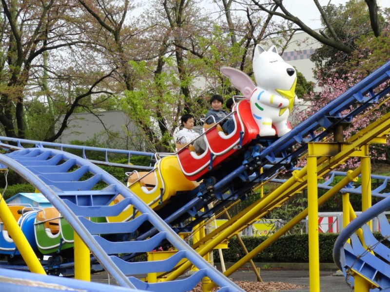 Yomiuriland is one of Tokyo’s many amusement parks and it can be found west of the city centre. This isn’t a theme park: decoration is limited and the overall atmosphere is rather bland. Still, Yomiuriland offers a few interesting roller coasters, so we decided to give the park a try. And I’ve got some good news for my dog-loving readers. Yomiurland’s mascot is a very unhappy dog. I don’t know what’s wrong with that dog, but he looks like someone has just stolen his bone.